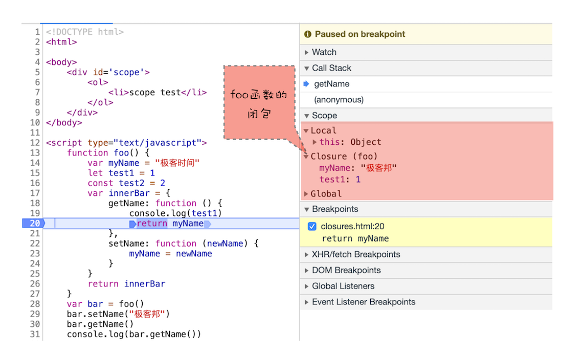 从图中可以看出来,当调用bar.getName的时候,右边Scope项就体现出了作用域链的情况:Local就是当前的getName函数的作用域,Closure(foo)是指foo函数的闭包,最下面的Global就是指全局作用域,从“Local–>Closure(foo)–>Global”就是一个完整的作用域链。