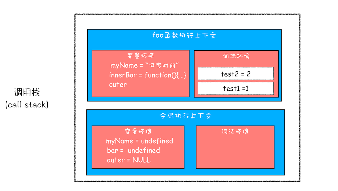 比如上面那段代码在查找myName变量时,如果在当前的变量环境中没有查找到,那么JavaScript引擎会继续在outer所指向的执行上下文中查找。为了直观理解,你可以看下面这张图: