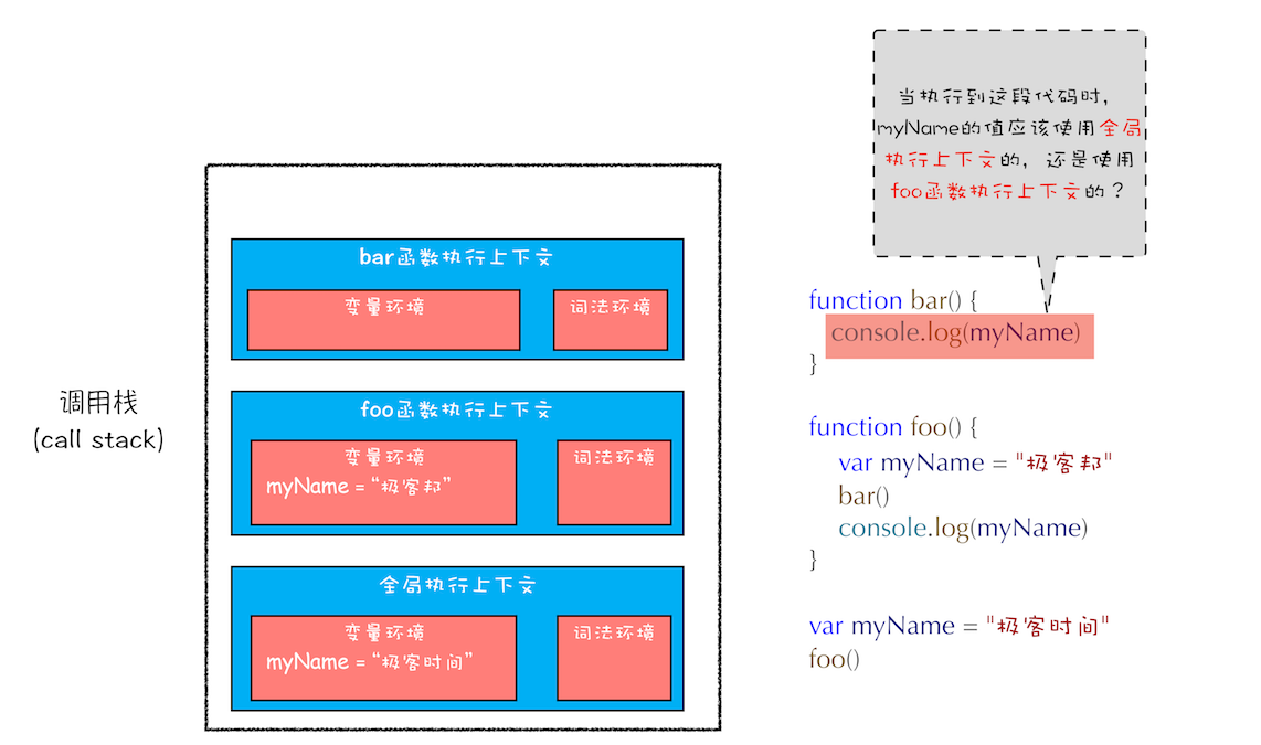 从图中可以看出,全局执行上下文和foo函数的执行上下文中都包含变量myName,那bar函数里面myName的值到底该选择哪个呢?