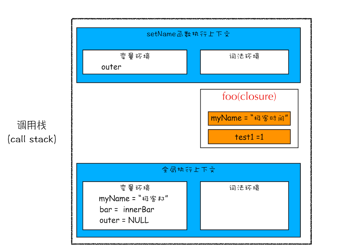 从图中可以看出,setName的执行上下文中没有myName变量,foo函数的闭包中包含了变量myName,所以调用setName时,会修改foo闭包中的myName变量的值。