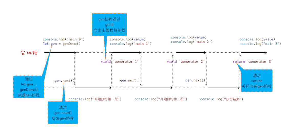 let gen = foo(),创建了gen协程。然后在父协程中通过执行gen.next把主线程的控制权交给gen协程。