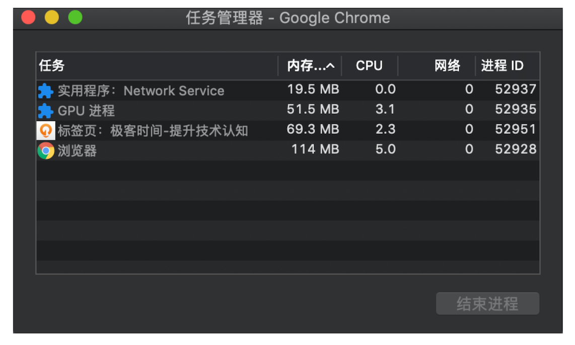 和Windows任务管理器一样,Chrome任务管理器也是用来展示运行中Chrome使用的进程信息的。从图中可以看到,Chrome启动了4个进程,你也许会好奇,只是打开了1个页面,为什么要启动这么多进程呢?