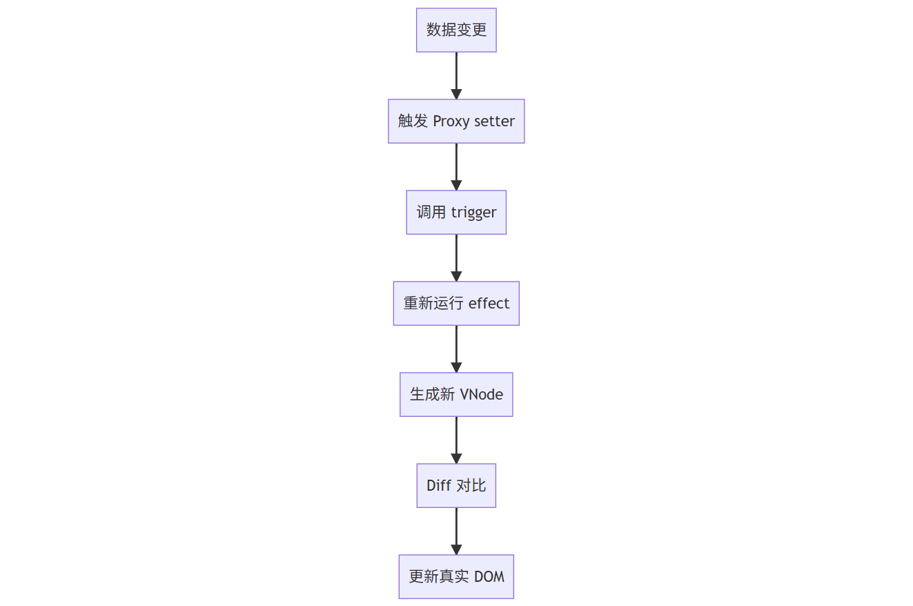trigger 函数会通知所有依赖该数据的 effect 函数(包括渲染函数)。这些 effect 会重新运行,生成新的 VNode。