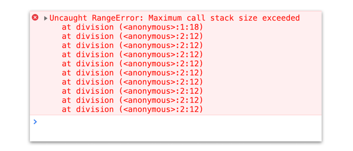 那为什么会出现这个问题呢?这是因为当JavaScript引擎开始执行这段代码时,它首先调用函数division,并创建执行上下文,压入栈中;然而,这个函数是递归的,并且没有任何终止条件,所以它会一直创建新的函数执行上下文,并反复将其压入栈中,但栈是有容量限制的,超过最大数量后就会出现栈溢出的错误。